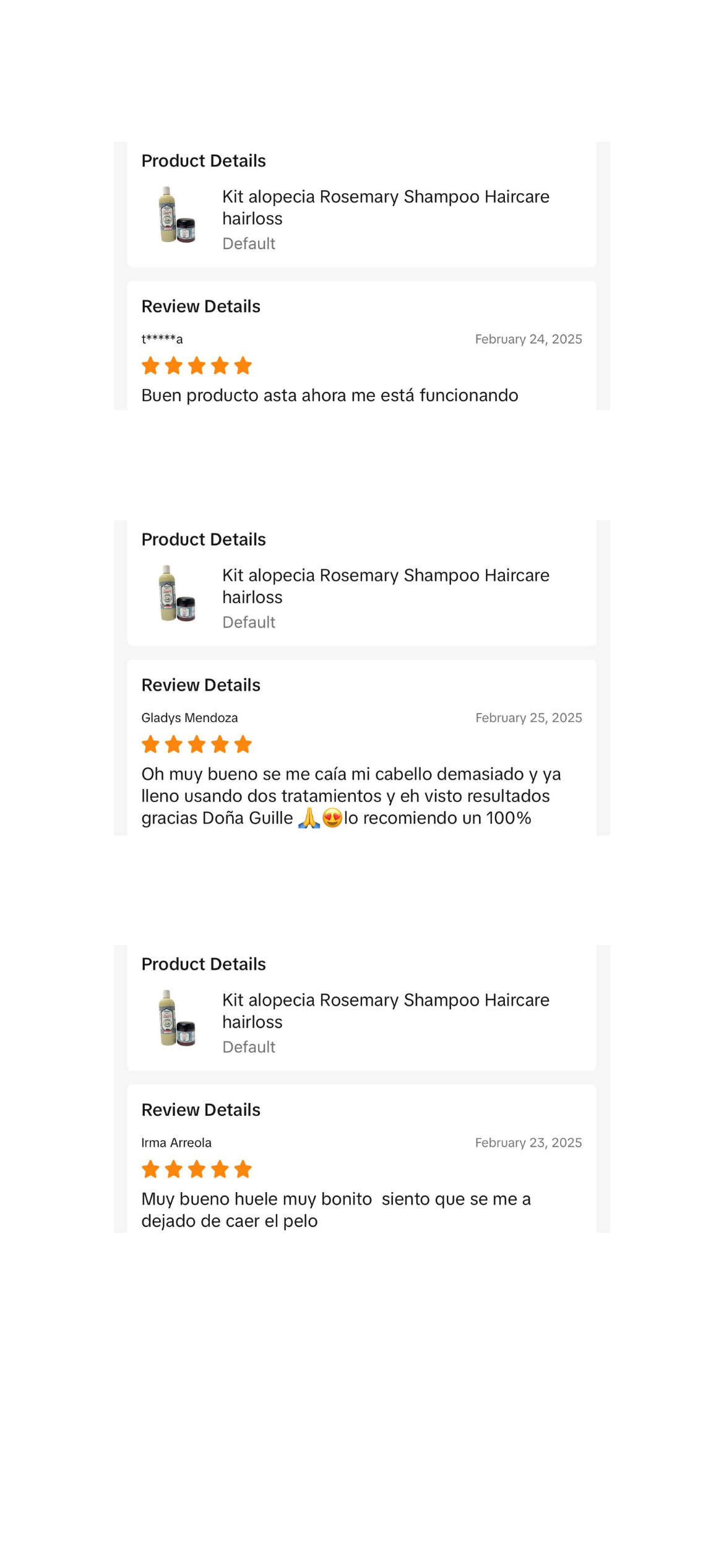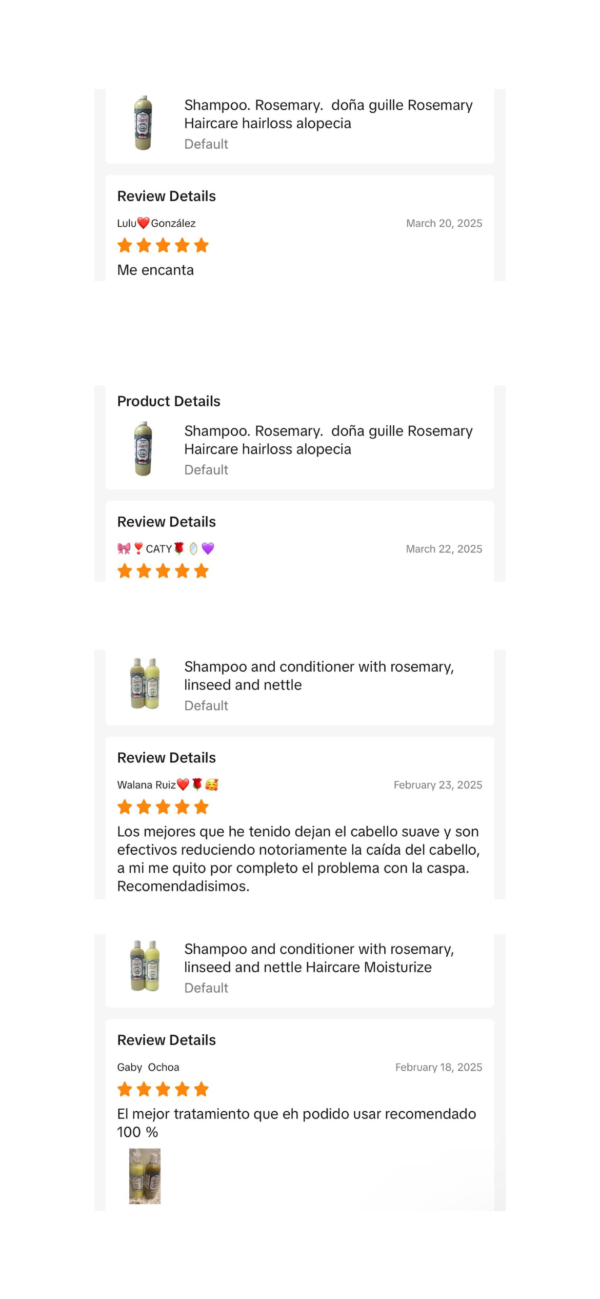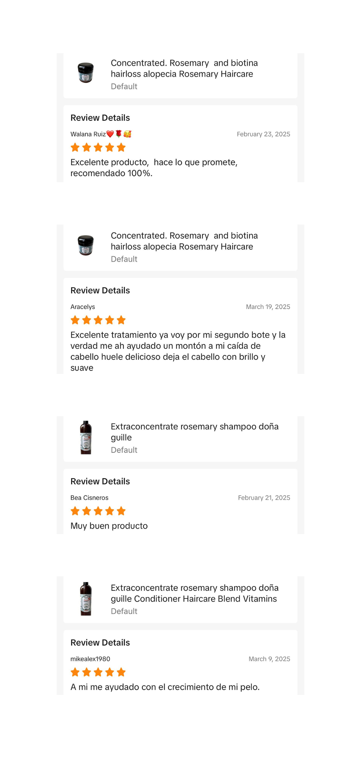 Carolina, concerned about the natural recovery of hair, began to delve into the natural world, creating her artisanal formula with these products that have helped restore hair for 9 out of 10 people. Committed to natural ingredients such as Rosemary, flaxseed, and sunflower seed. The name Doña Guille was inspired by her mother